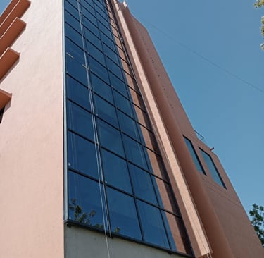 Front Side Facade Glass Work: The facade was engineered using premium-grade glass to enhance the building's "curb appeal" and provide a futuristic aesthetic that stands out in the Ahmedabad skyline.
